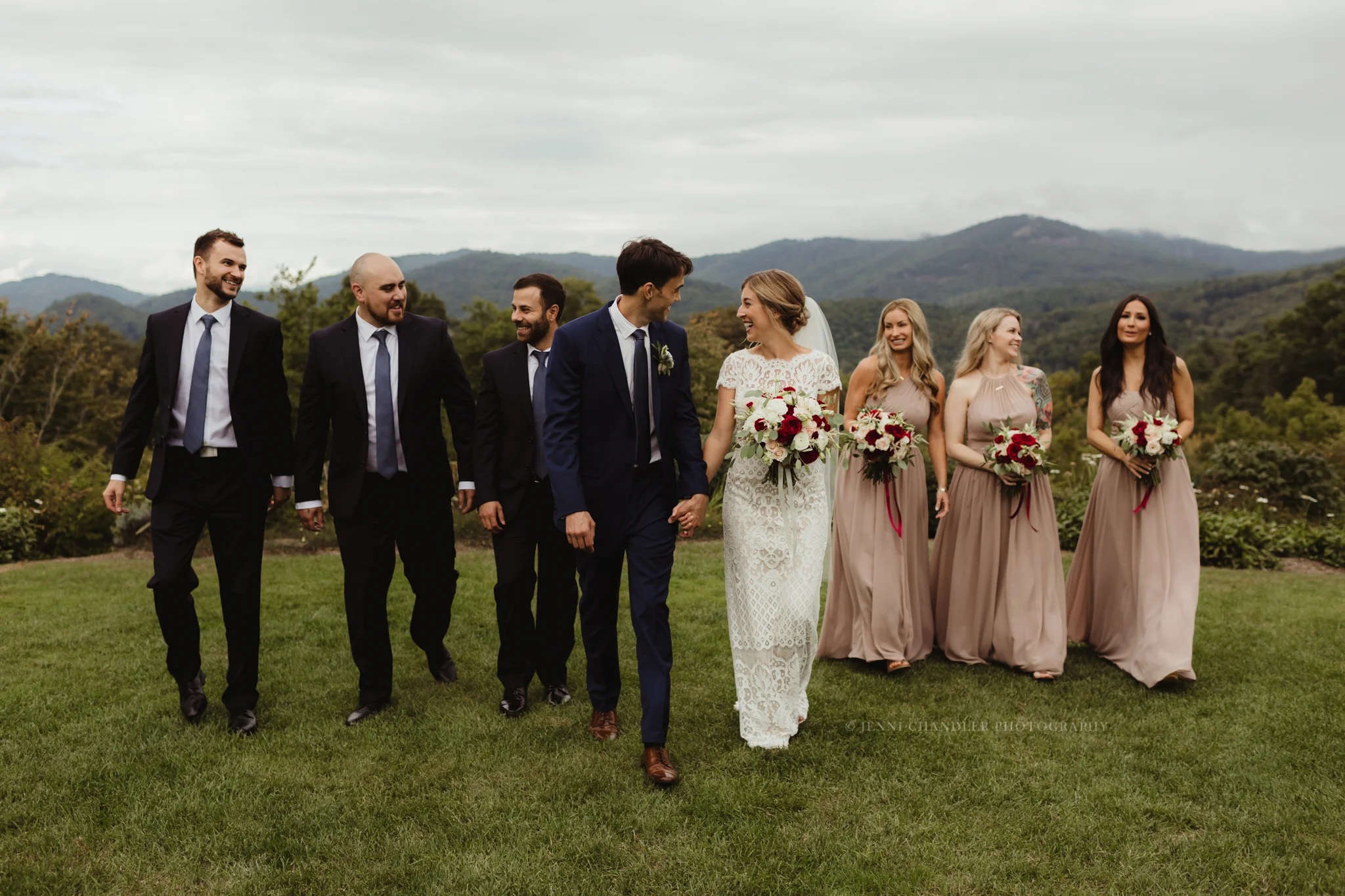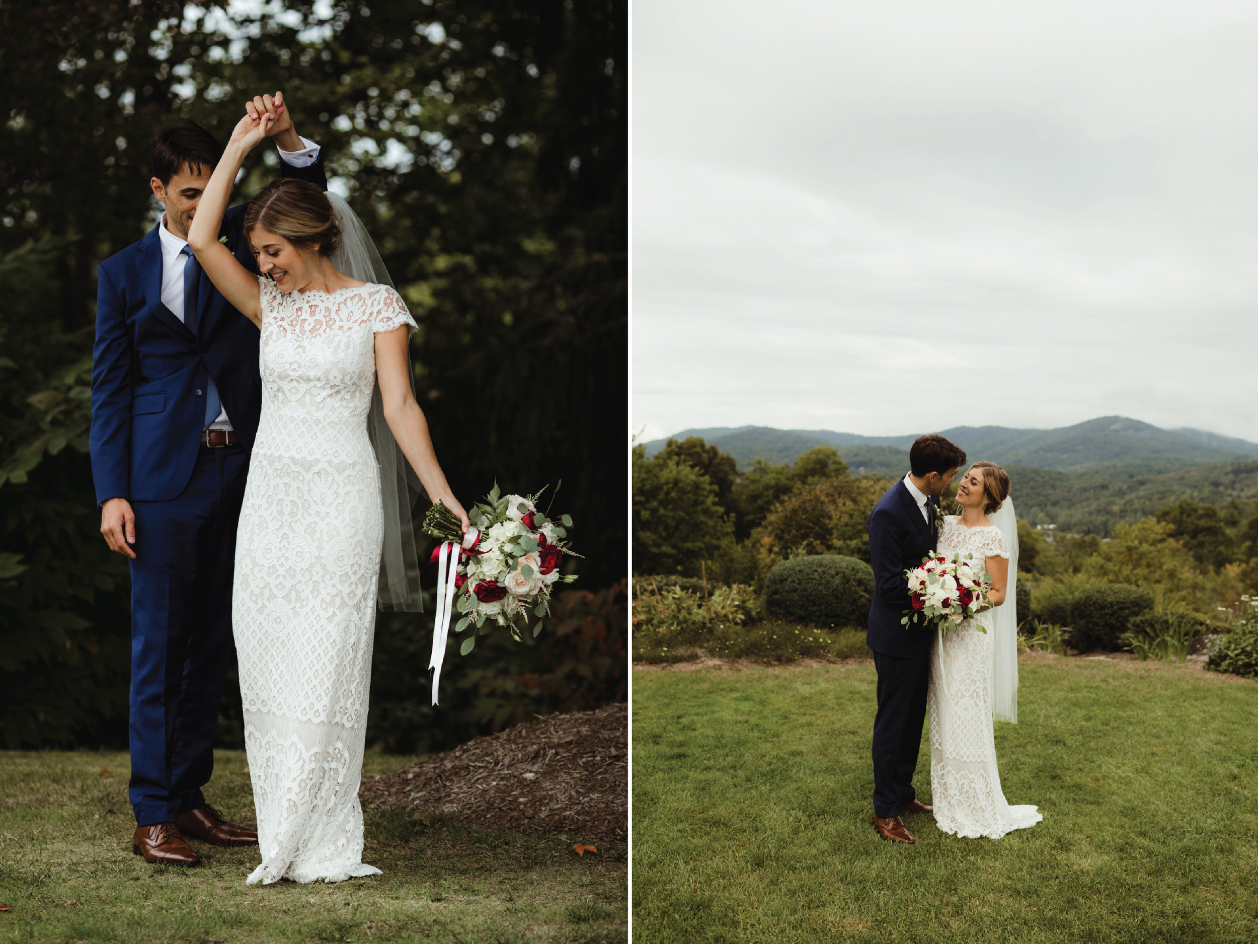 Brittany and Matt met in Texas, but it was in the Blue Ridge Mountains that Matt got down on one knee and proposed. They chose Trillium Links for their wedding venue, since it is right down the street from where Brittany's grandparents lived, and where she spent many happy times with her family growing up. The Blue Ridge Mountains are now a place that Brittany and Matt love going to together to create their own happy memories. We started out their wedding day at the lovely Old Edwards Inn & Spa in Highlands, NC where Brittany and her girls got ready together. Brittany looked flawless with her hair and makeup from Anarie! Old Edwards Inn offers a gorgeous mountain view and cozy quarters that were the perfect backdrop. For the ceremony, we traveled down the road to Trillium in Cashiers, NC and joined Brittany and Matt’s friends and family for an intimate ceremony with the blue ridge mountains in sight. Their friends and family all traveled to join them for their wedding day - some flying as far as from Australia! After Keith Norton officiated a sweet ceremony, we utilized the scenery for some portraits, and then started the reception. The entire evening ran so smoothly and all the details came together perfectly, thanks to WNC Weddings & Events! Benjamin Warner pulled out his drums and brought everyone out to the dance floor. Brittany and Matt didn’t stop smiling the whole day. Intimate weddings with mountain views are always a favorite!